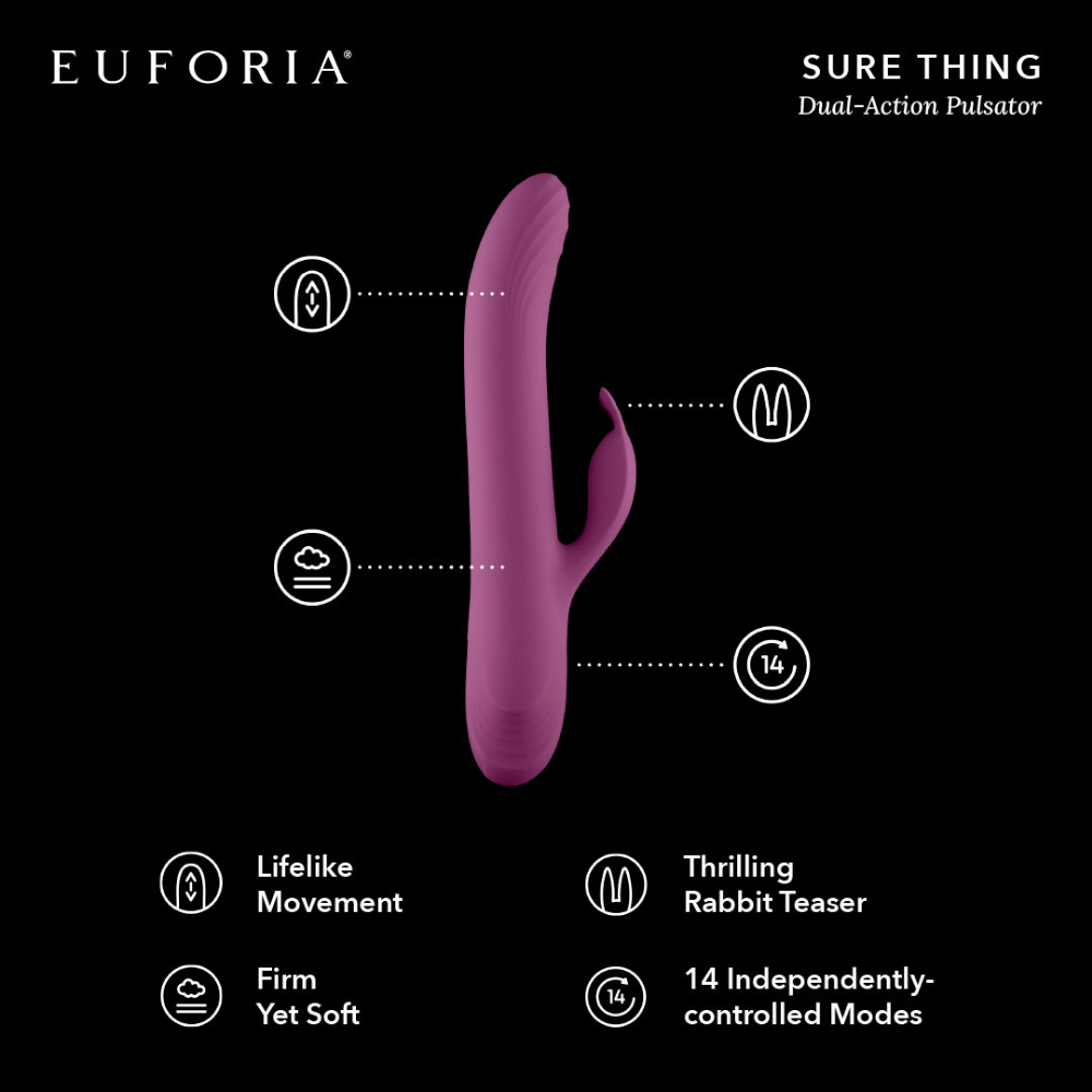 It may look familiar, but this feature-packed dual-action bedroom tool isn't like other vibrators. With a vibrating rabbit teaser and unique pulsator thrusting action, Sure Thing is one unforgettable ride.